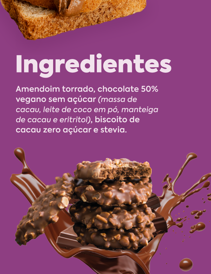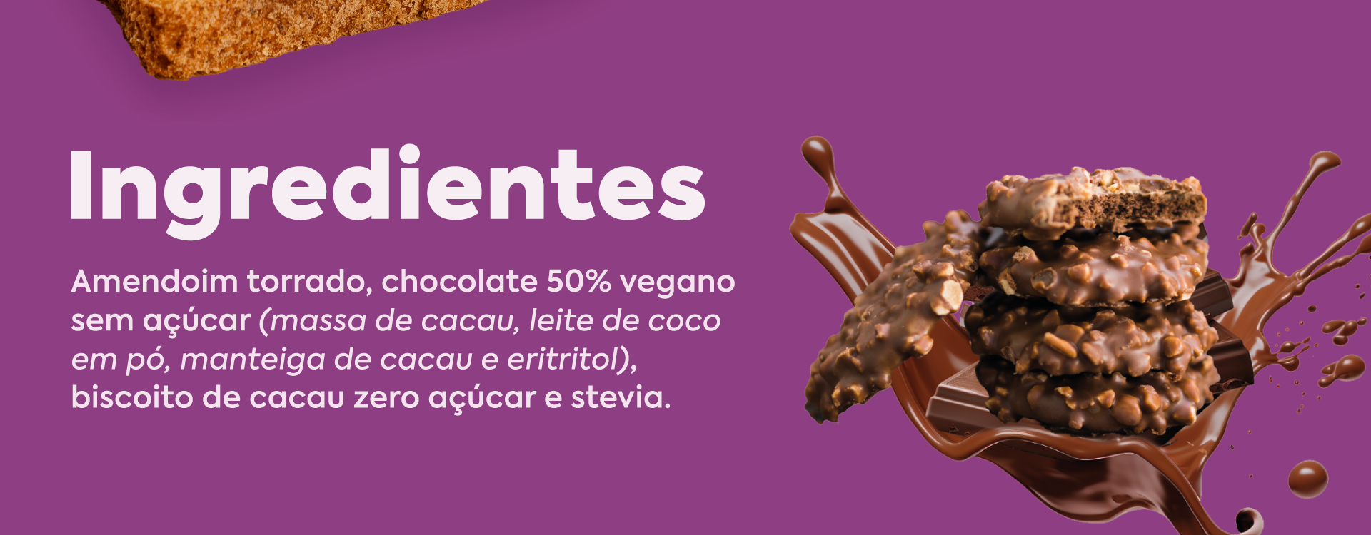 Amendoim torrado, chocolate 50% vegano sem açúcar (massa de cacau, leite de coco em pó, manteiga de cacau e eritritol), biscoito de cacau zero açúcar e stevia.