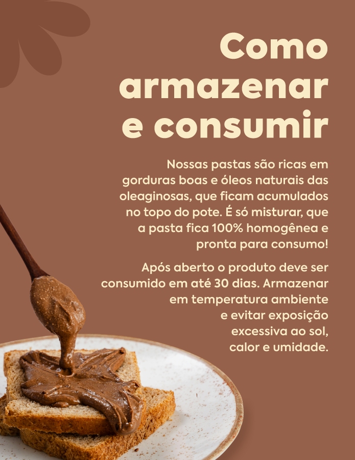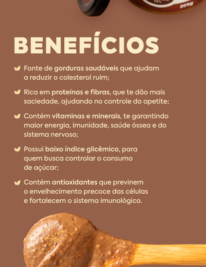 Experimente agora e desafiamos você a não querer adicionar essa pasta em todas as suas refeições diárias! Esqueça cremes de avelã carregados de açúcar e gordura vegetal. Nossa pastinha entregará muito mais sabor e nutrição. Sem açúcar, sem lactose e com muito muito sabor.
