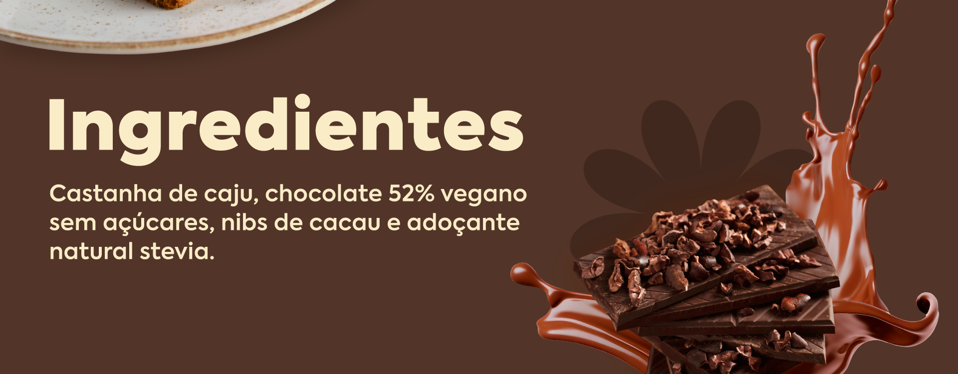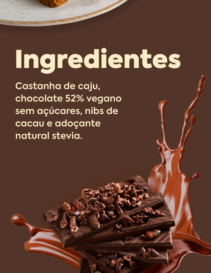 Castanha de caju, chocolate 52% vegano ( leite de coco em pó, manteiga de cacau, cacau em pó), nibs de cacau e blend de adoçantes naturais.