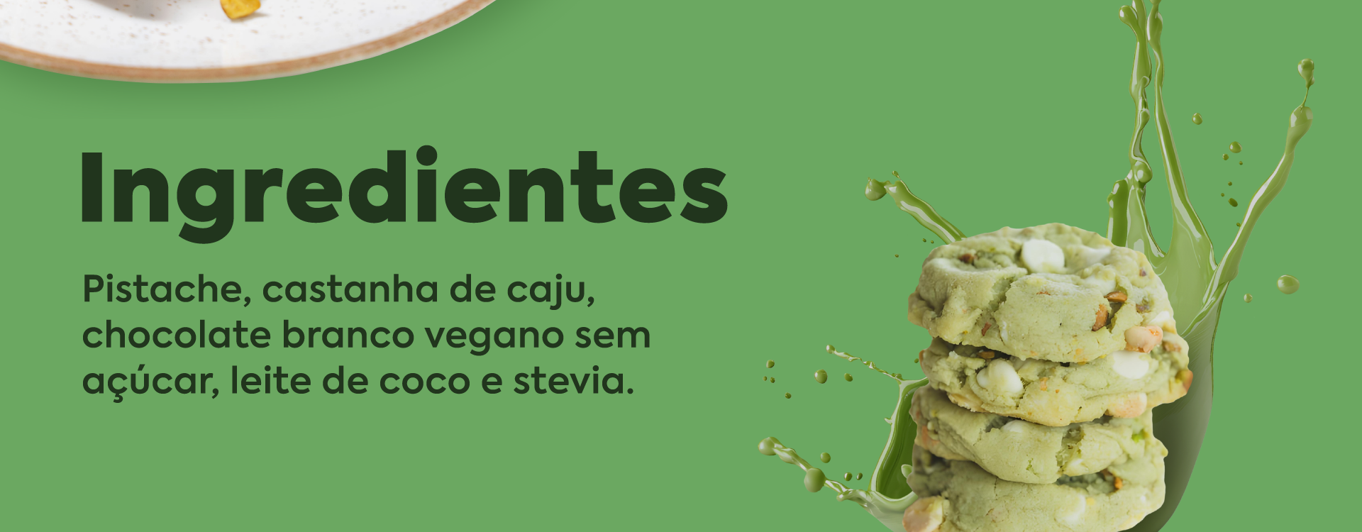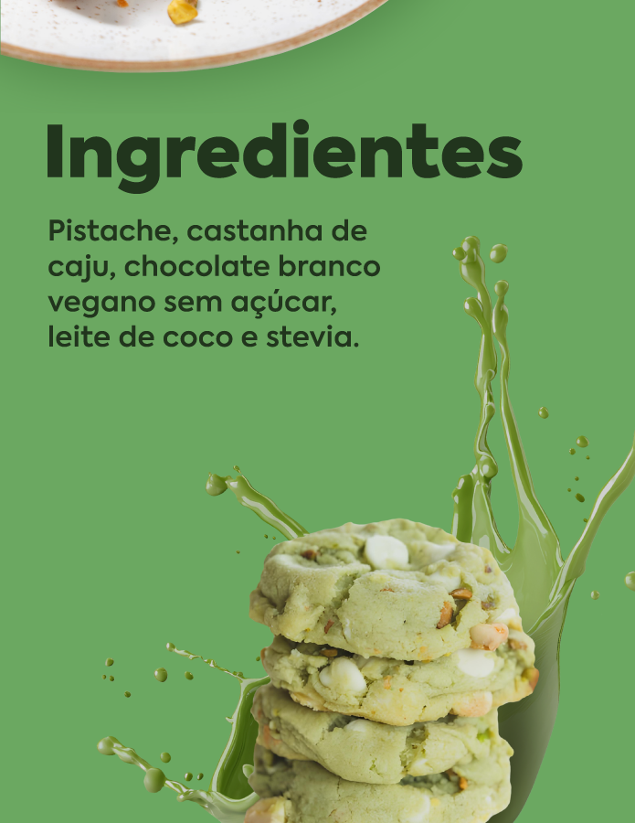 Pistache, castanha de caju, leite de coco em pó, manteiga de cacau e estévia.